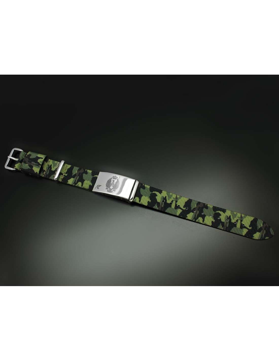 Bracelet EXERCISE based on aesthetics green camouflage created by Aviador Watch for the 2015 season. The first collection of Aviador bracelets exploits the showiness of the blued steel of the highest quality treated with laser beams to make the inscriptions. The result is especially innovative.