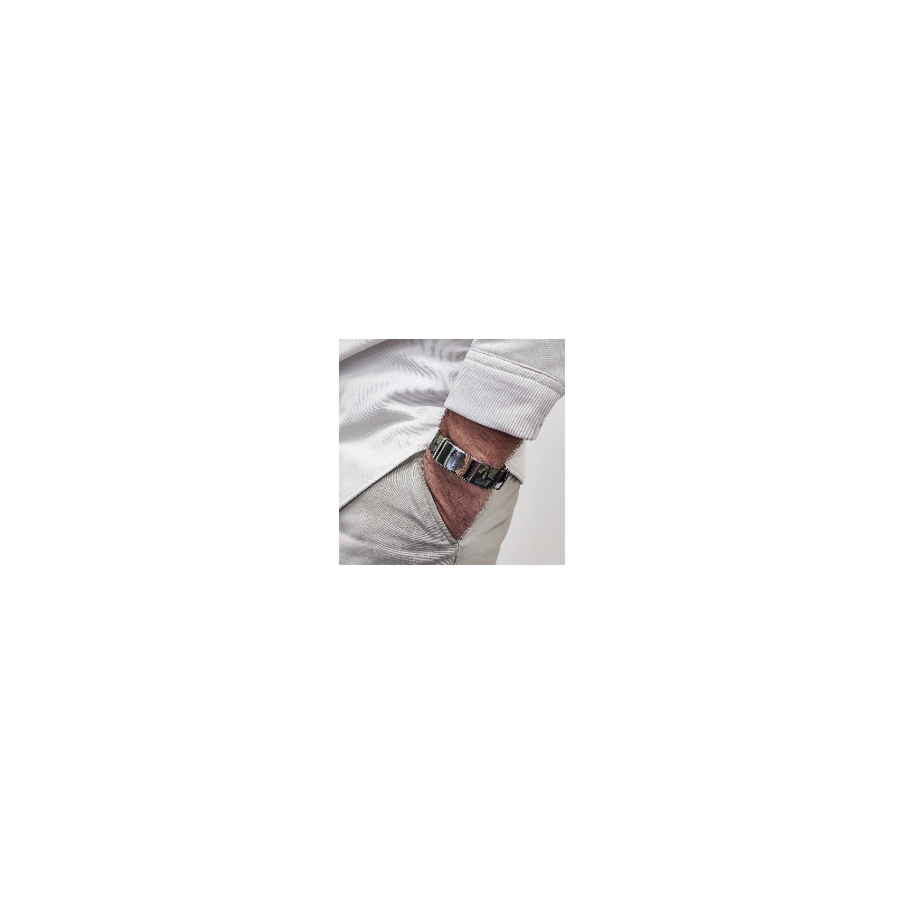 Colorful and innovative green camouflage ARMY bracelet made of blued steel and textile canvas.