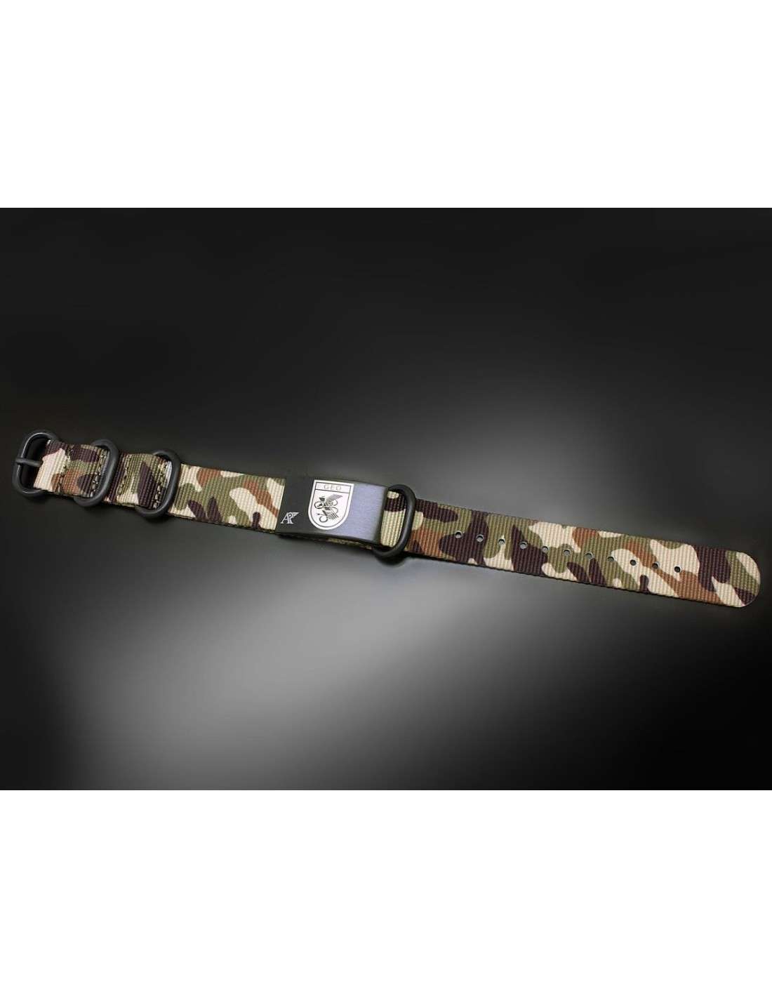 Bracelet GEO basé sur l'esthétique camouflage marron créé par Aviador Watch pour la saison 2015. La première collection de bracelets Aviateur exploite la voyance de la acier bleui de la plus haute qualité traitée avec faisceaux laser pour faire les inscriptions. Le résultat est particulièrement innovant.